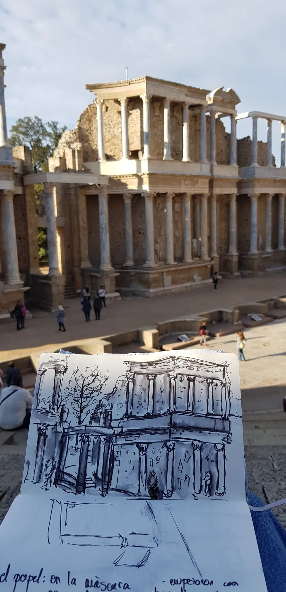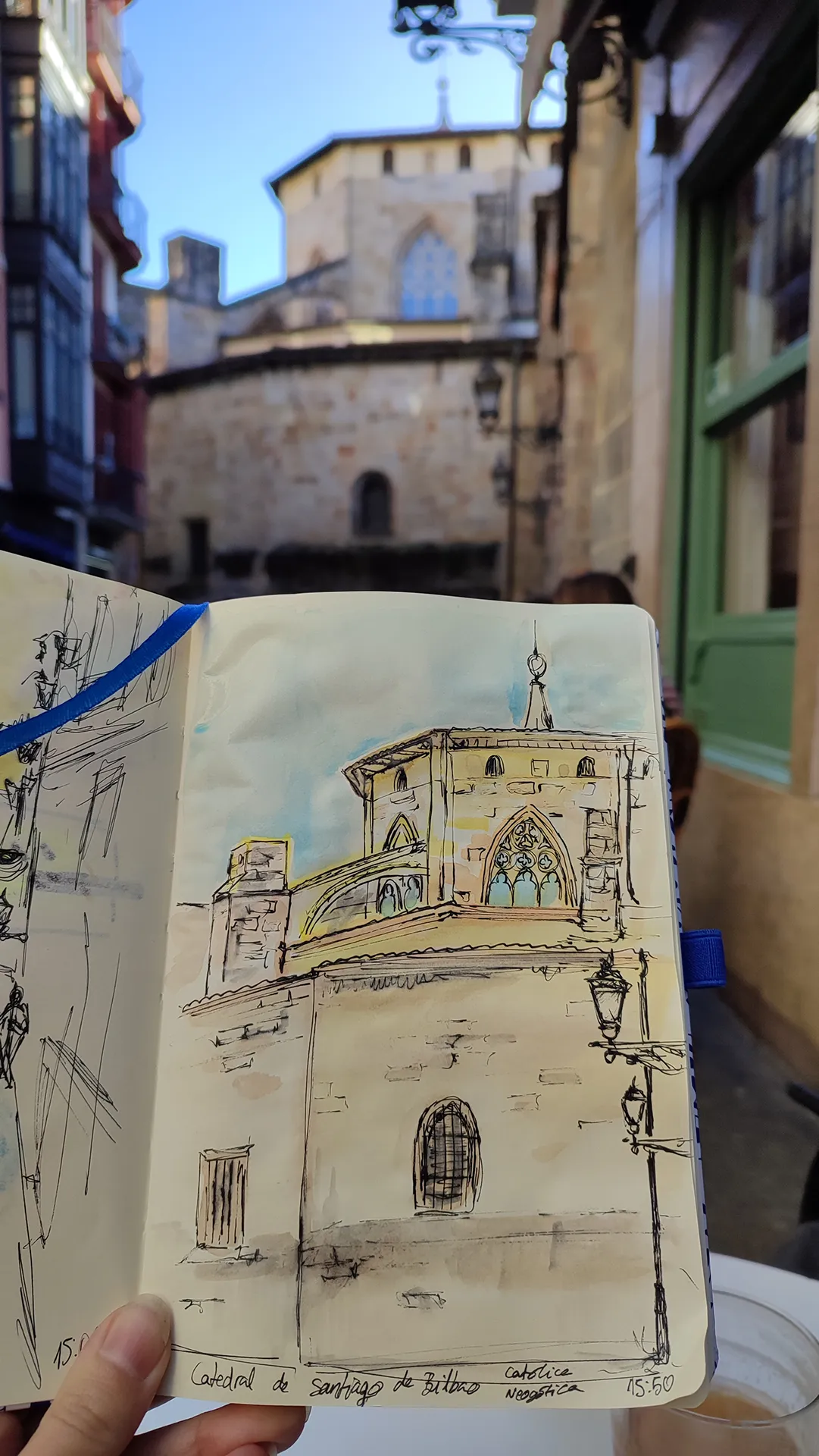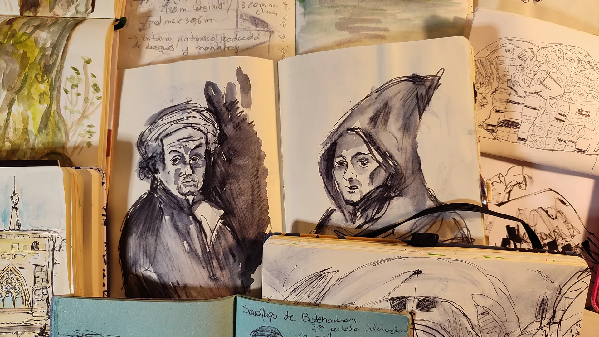 Para mí, el cuaderno y el dibujo al natural es la mejor herramienta de aprendizaje en un viaje, pero también en nuestro día a día, una forma de aprender a mirar, a interiorizar y más tarde a recordar, ya que al contemplarlo te traslada al momento en el que fue creado. Son un recuerdo de lo vivido, de los viajes, los teatros, los conciertos, el café con un ser querido, el paisaje, la montaña, el mar o esa puerta que tanto te gusta cuando pasas por una calle, es el recipiente de tu imaginación y el reflejo de tu mirada, en él aparecen lo que capta tu atención. Pero el mayor de los regalos que aporta el Cuaderno de Bitácora, es el tiempo, el enseñar a pararse en este mundo veloz, enseñar a mirar detenidamente y a contemplar cada rincón de aquello que va a ser plasmado.