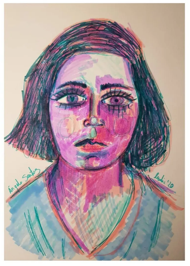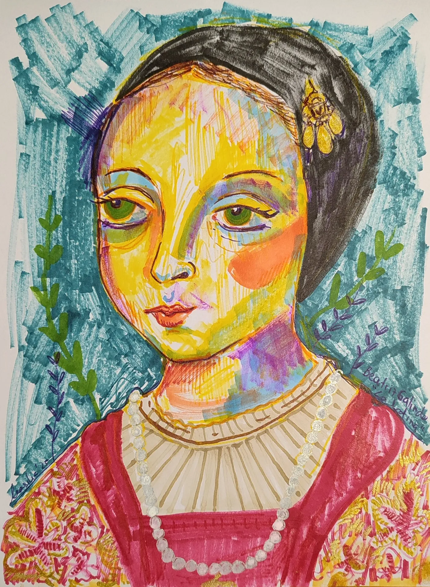 La fascinación por la Historia del Arte y la Historia, y la curiosidad de buscar figuras femeninas que nunca aparecieron en los libros del colegio ni del instituto, me llevaron a indagar en la cantidad de mujeres que han existido a lo largo de los tiempo, a nivel tanto artístico como de figuras históricas, un acercamiento teórico que empezó como este interés personal y que se está conformando en un futuro libro. Pero también un acercamiento visual, de mirada a mirada (en la medida de lo posible) a partir de fotografías, retratos e incluso mosaicos, como en el caso de Teodora, dibujos realizados generalmente a rotulador, sin bocetos previos ni correcciones, en los que el color y el grafismo se vuelven protagonistas, realizadas en su mayoría con rotuladores incluso a medio gastar, en ocasiones, pocas, acompañados de lápiz o acuarela.