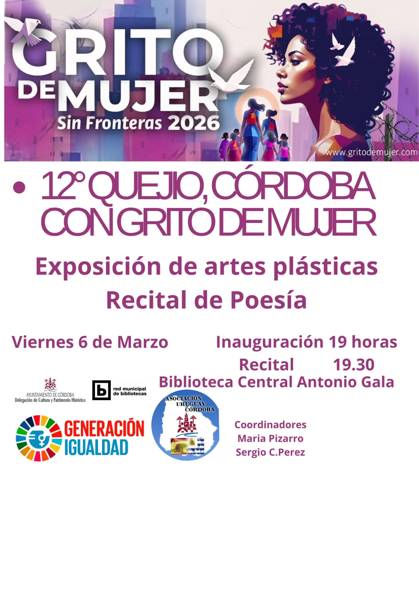 Por otro lado, a las 19:00 h en Córdoba, en la Biblioteca Central Antonio Gala, se presenta Grito de Mujer Sin Fronteras 2026, exposición de artes plásticas y recital de poesía, coordinado por María Pizarro y Sergio C.Pérez.